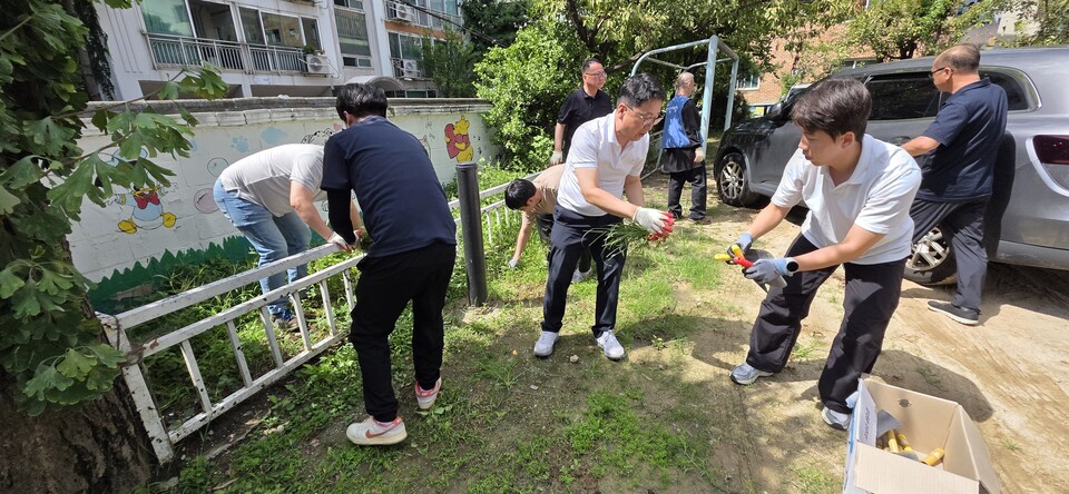 봉사활동에 참여한 산업특수가스협회 및 회원사, 그리고 가스안전공사 서울광역본부 직원이 강동꿈마을에서 풀뽑기를 하고 있다.